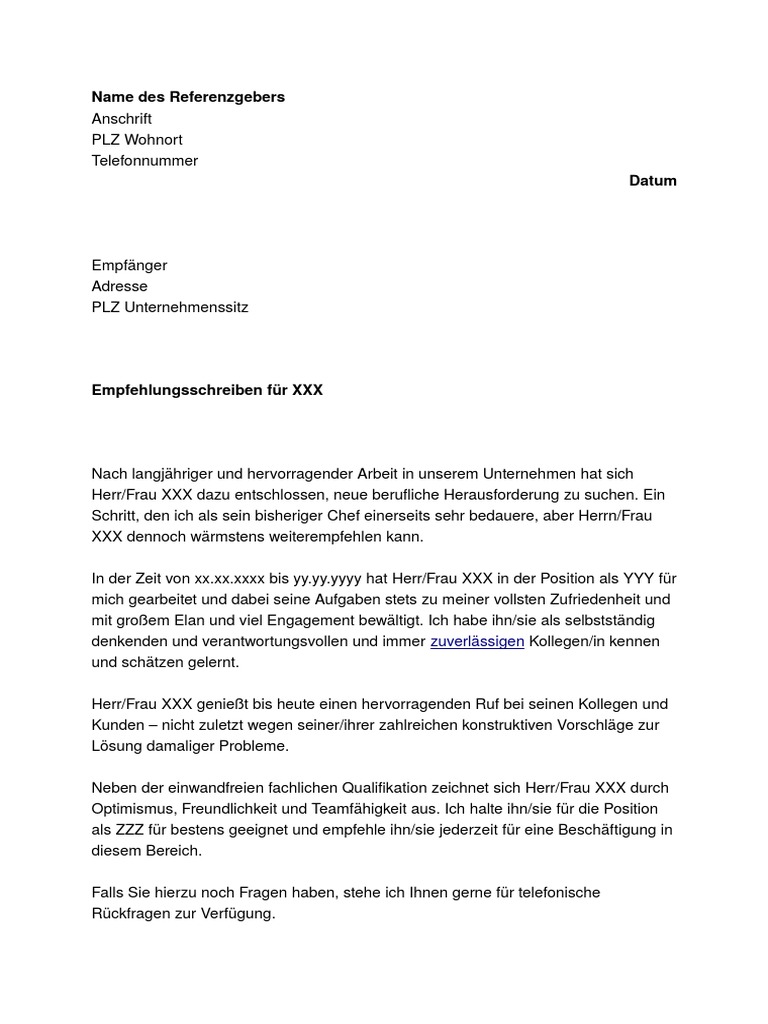 Empfehlungsschreiben Zum Downloaden Wordvorlage De